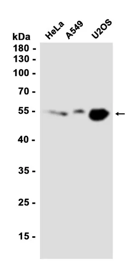 Western blot detection of EFEMP1/Fibulin-3 in Hela,A549,HL-60,U2OS cell lysates using EFEMP1/Fibulin-3 antibody(1:1000 diluted).